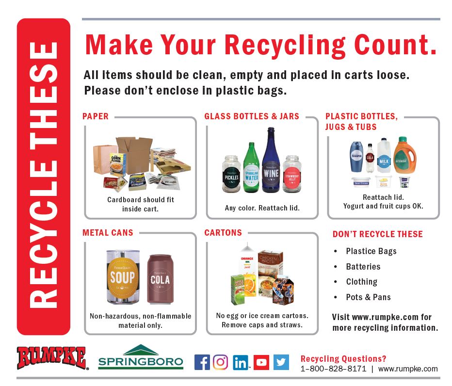 Rumpke provides trash hauling, recycling, yard waste and bulk-item pickups for City of Springboro residents. For service updates and reminders, send an email to service.alerts@rumpke.com with your service address.
